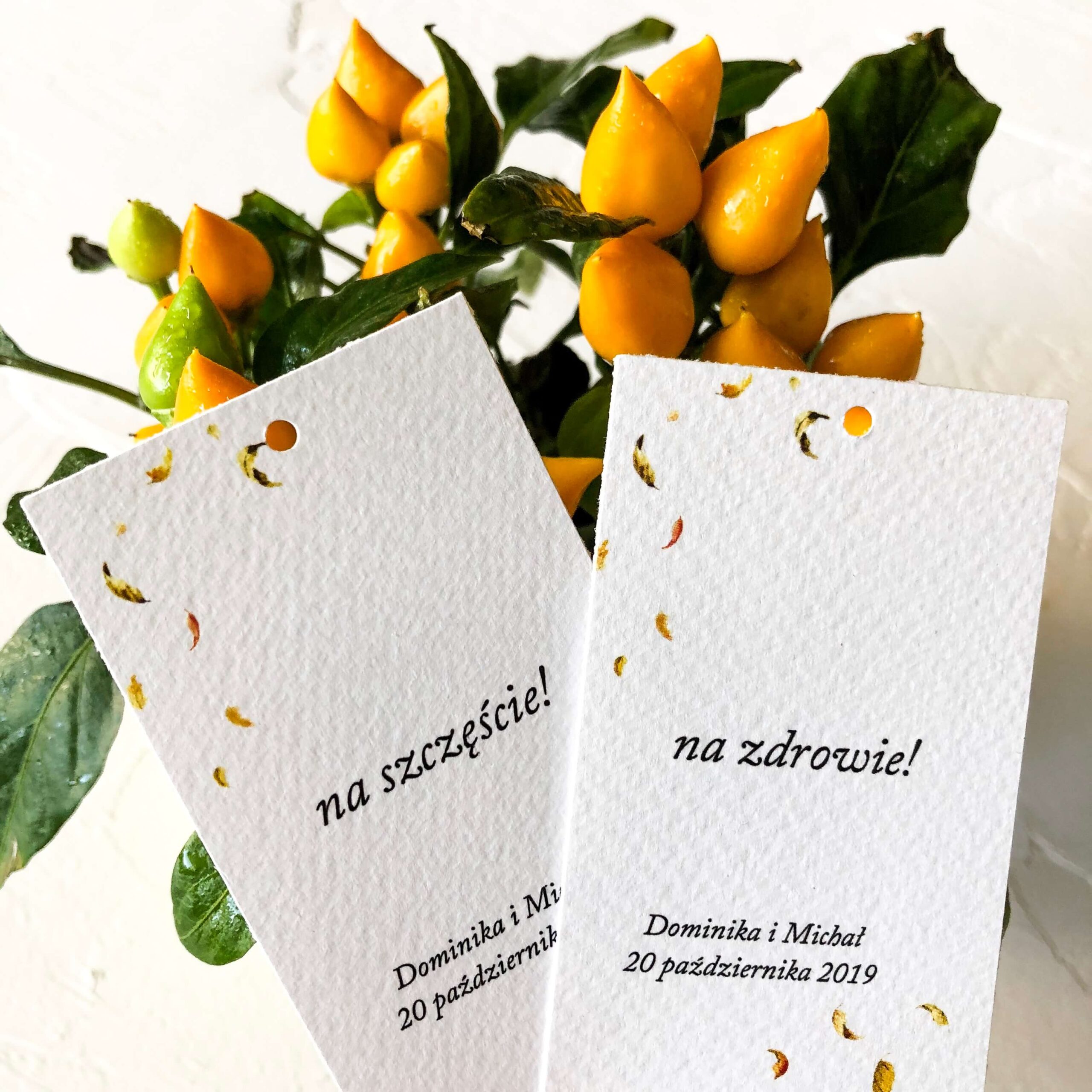- grafika na etykietach weselnych: dostosowana do motywu zaproszeń